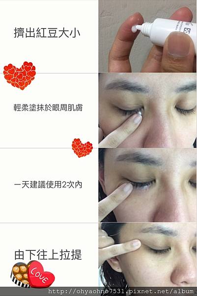 2.使用方式:早晚清潔完成肌膚保養後,擠出一顆紅豆大小,輕柔塗抹於眼周肌膚,一天建議使用2次以內